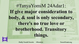 #TanyaYomiM 24Adar1: If give major consideration to body, & soul is only secondary, there’s no true love or brotherhood. Transitory things.