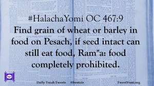 #HalachaYomi OC 467:9 Find grain of wheat or barley in food on Pesach, if seed intact can still eat food, Ram”a: food completely prohibited.