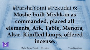 #ParshaYomi #Pekudai 6: Moshe built Mishkan as commanded, placed all elements, Ark, Table, Menora, Altar. Kindled lamps, offered incense.