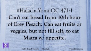 #HalachaYomi OC 471:1 Can’t eat bread from 10th hour of Erev Pesach. Can eat fruits or veggies, but not fill self; to eat Matza w/ appetite.