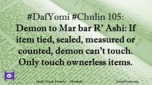 Chulin, DafYomi #DafYomi #Chulin 105 Date: March 12, 2019Author: ysspitz #DafYomi #Chulin 105: Demon to Mar bar R’ Ashi: If item tied, sealed, measured or counted, demon can’t touch. Only touch ownerless items. Share this: Share on X (Opens in new window) X Share on Facebook (Opens in new window) Facebook Like Loading... Related