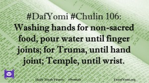 Chulin, DafYomi #DafYomi #Chulin 106 Date: March 13, 2019Author: ysspitz #DafYomi #Chulin 106: Washing hands for non-sacred food, pour water until finger joints; for Truma, until hand joint; Temple, until wrist. Share this: Share on X (Opens in new window) X Share on Facebook (Opens in new window) Facebook Like Loading... Related