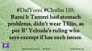 Chulin, DafYomi #DafYomi #Chulin 110 Date: March 19, 2019Author: ysspitz #DafYomi #Chulin 110: Rami b Tamrei had stomach problems, didn’t wear Tfilin, as per R’ Yehuda’s ruling who says exempt if has such issues. Share this: Share on X (Opens in new window) X Share on Facebook (Opens in new window) Facebook Like Loading... Related