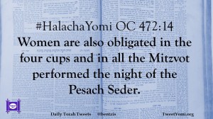 #HalachaYomi OC 472:14 Women are also obligated in the four cups and in all the Mitzvot performed the night of the Pesach Seder.