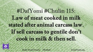 Chulin, DafYomi #DafYomi #Chulin 115 Date: March 23, 2019Author: ysspitz #DafYomi #Chulin 115: Law of meat cooked in milk stated after animal carcass law. If sell carcass to gentile don’t cook in milk & then sell. Share this: Share on X (Opens in new window) X Share on Facebook (Opens in new window) Facebook Like Loading... Related