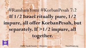 #RambamYomi #KorbanPesah 7:2 If 1/2 Israel ritually pure, 1/2 impure, all offer KorbanPesah, but separately. If >1/2 impure, all together.