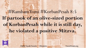 #RambamYomi #KorbanPesah 8:5 If partook of an olive-sized portion of KorbanPesah while it is still day, he violated a positive Mitzva.
