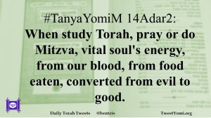#TanyaYomiM 14Adar2: When study Torah, pray or do Mitzva, vital soul’s energy, from our blood, from food eaten, converted from evil to good.