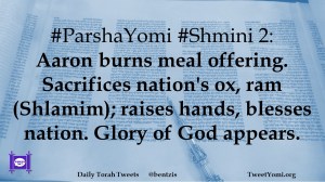 #ParshaYomi #Shmini 2: Aaron burns meal offering. Sacrifices nation’s ox, ram (Shlamim); raises hands, blesses nation. Glory of God appears.