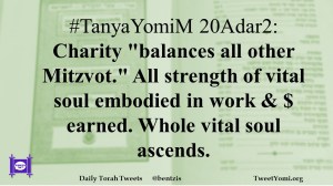#TanyaYomiM 20Adar2: Charity “balances all other Mitzvot.” All strength of vital soul embodied in work & $ earned. Whole vital soul ascends.