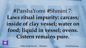 #ParshaYomi #Shmini 7: Laws ritual impurity: carcass; inside of clay vessel; water on food; liquid in vessel; ovens. Cistern remains pure.