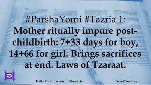 #ParshaYomi #Tazria 1: Mother ritually impure post-childbirth: 7+33 days for boy, 14+66 for girl. Brings sacrifices at end. Laws of Tzaraat.