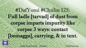 Chulin, DafYomi #DafYomi #Chulin 125 Date: April 2, 2019Author: ysspitz #DafYomi #Chulin 125: Full ladle [tarvad] of dust from corpse imparts impurity like corpse 3 ways: contact [bemagga], carrying, & in tent. Share this: Share on X (Opens in new window) X Share on Facebook (Opens in new window) Facebook Like Loading... Related