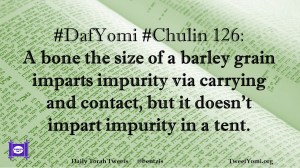 Chulin, DafYomi #DafYomi #Chulin 126 Date: April 2, 2019Author: ysspitz #DafYomi #Chulin 126: A bone the size of a barley grain imparts impurity via carrying and contact, but it doesn’t impart impurity in a tent. Share this: Share on X (Opens in new window) X Share on Facebook (Opens in new window) Facebook Like Loading... Related