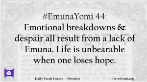 EmunaYomi #EmunaYomi 44 Date: April 2, 2019Author: ysspitz #EmunaYomi 44: Emotional breakdowns & despair all result from a lack of Emuna. Life is unbearable when one loses hope. Share this: Share on X (Opens in new window) X Share on Facebook (Opens in new window) Facebook Like Loading... Related