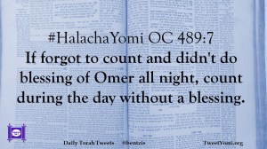 HalachaYomi #HalachaYomi OC 489:7 Date: April 2, 2019Author: ysspitz #HalachaYomi OC 489:7 If forgot to count and didn’t do blessing of Omer all night, count during the day without a blessing. Share this: Share on X (Opens in new window) X Share on Facebook (Opens in new window) Facebook Like Loading... Related