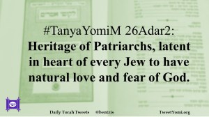 TanyaYomiM #TanyaYomiM 26Adar2 Date: April 2, 2019Author: ysspitz #TanyaYomiM 26Adar2: Heritage of Patriarchs, latent in heart of every Jew to have natural love and fear of God. Share this: Share on X (Opens in new window) X Share on Facebook (Opens in new window) Facebook Like Loading... Related
