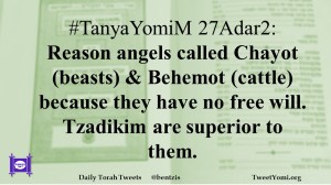 #TanyaYomiM 27Adar2: Reason angels called Chayot (beasts) & Behemot (cattle) because they have no free will. Tzadikim are superior to them.