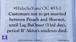 #HalachaYomi OC 493:1 Customary not to get married between Pesach and Shavuot, until Lag BaOmer (33rd day), period R’ Akiva’s students died.
