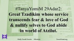 #TanyaYomiM 29Adar2: Great Tzadikim whose service transcends fear & love of God & nullify selves to God abide in world of Atzilut.