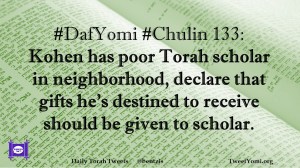 Chulin, DafYomi #DafYomi #Chulin 133 Date: April 9, 2019Author: ysspitz #DafYomi #Chulin 133: Kohen has poor Torah scholar in neighborhood, declare that gifts he’s destined to receive should be given to scholar. Share this: Share on X (Opens in new window) X Share on Facebook (Opens in new window) Facebook Like Loading... Related