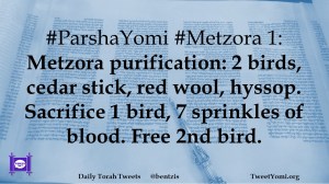 #ParshaYomi #Metzora 1: Metzora purification: 2 birds, cedar stick, red wool, hyssop. Sacrifice 1 bird, 7 sprinkles of blood. Free 2nd bird.