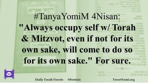 #TanyaYomiM 4Nisan: “Always occupy self w/ Torah & Mitzvot, even if not for its own sake, will come to do so for its own sake.” For sure.