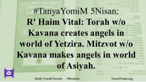 #TanyaYomiM 5Nisan: R’ Haim Vital: Torah w/o Kavana creates angels in world of Yetzira. Mitzvot w/o Kavana makes angels in world of Asiyah.
