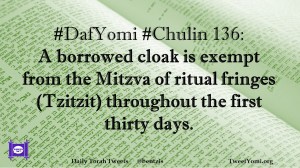 Chulin, DafYomi #DafYomi #Chulin 136 Date: April 12, 2019Author: ysspitz #DafYomi #Chulin 136: A borrowed cloak is exempt from the Mitzva of ritual fringes (Tzitzit) throughout the first thirty days. Share this: Share on X (Opens in new window) X Share on Facebook (Opens in new window) Facebook Like Loading... Related