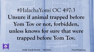 #HalachaYomi OC 497:3 Unsure if animal trapped before Yom Tov or not, forbidden, unless knows for sure that were trapped before Yom Tov.