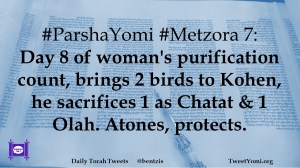 #ParshaYomi #Metzora 7: Day 8 of woman’s purification count, brings 2 birds to Kohen, he sacrifices 1 as Chatat & 1 Olah. Atones, protects.