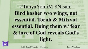 #TanyaYomiM 8Nisan: Bird kosher w/o wings, not essential. Torah & Mitzvot essential. Doing them w/ fear & love of God reveals God’s light.