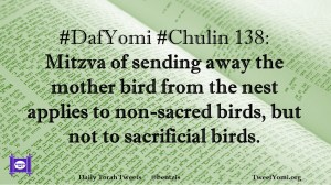Chulin, DafYomi #DafYomi #Chulin 138 Date: April 14, 2019Author: bentzis #DafYomi #Chulin 138: Mitzva of sending away the mother bird from the nest applies to non-sacred birds, but not to sacrificial birds. Share this: Share on X (Opens in new window) X Share on Facebook (Opens in new window) Facebook Like Loading... Related