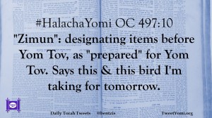 #HalachaYomi OC 497:10 “Zimun”: designating items before Yom Tov, as “prepared” for Yom Tov. Says this & this bird I’m taking for tomorrow.