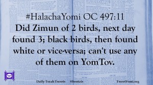 #HalachaYomi OC 497:11 Did Zimun of 2 birds, next day found 3; black birds, then found white or vice-versa; can’t use any of them on YomTov.