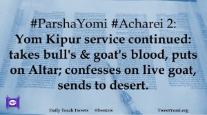#ParshaYomi #Acharei 2: Yom Kipur service continued: takes bull’s & goat’s blood, puts on Altar; confesses on live goat, sends to desert.