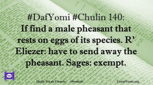 Chulin, DafYomi #DafYomi #Chulin 140 Date: April 16, 2019Author: bentzis #DafYomi #Chulin 140: If find a male pheasant that rests on eggs of its species. R’ Eliezer: have to send away the pheasant. Sages: exempt. Share this: Share on X (Opens in new window) X Share on Facebook (Opens in new window) Facebook Like Loading... Related