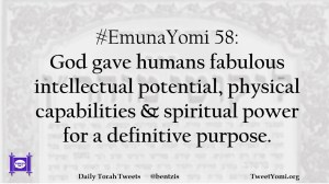 #EmunaYomi 58: God gave humans fabulous intellectual potential, physical capabilities & spiritual power for a definitive purpose.