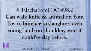 #HalachaYomi OC 498:2 Can walk knife & animal on Yom Tov to butcher to slaughter, even young lamb on shoulder, even if could’ve day before.