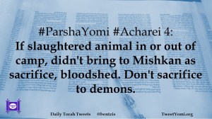 #ParshaYomi #Acharei 4: If slaughtered animal in or out of camp, didn’t bring to Mishkan as sacrifice, bloodshed. Don’t sacrifice to demons.