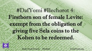 Bechorot, DafYomi #DafYomi #Bechorot 4 Date: April 19, 2019Author: ysspitz #DafYomi #Bechorot 4: Firstborn son of female Levite: exempt from the obligation of giving five Sela coins to the Kohen to be redeemed. Share this: Share on X (Opens in new window) X Share on Facebook (Opens in new window) Facebook Like Loading... Related