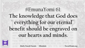 EmunaYomi #EmunaYomi 61 Date: April 19, 2019Author: ysspitz #EmunaYomi 61: The knowledge that God does everything for our eternal benefit should be engraved on our hearts and minds. Share this: Share on X (Opens in new window) X Share on Facebook (Opens in new window) Facebook Like Loading... Related