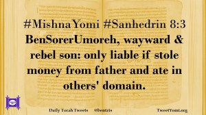 #MishnaYomi #Sanhedrin 8:3 BenSorerUmoreh, wayward & rebel son: only liable if stole money from father and ate in others’ domain.