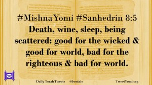 #MishnaYomi #Sanhedrin 8:5 Death, wine, sleep, being scattered: good for the wicked & good for world, bad for the righteous & bad for world.