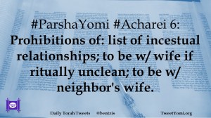 #ParshaYomi #Acharei 6: Prohibitions of: list of incestual relationships; to be w/ wife if ritually unclean; to be w/ neighbor’s wife.