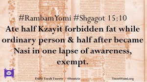 #RambamYomi #Shgagot 15:10 Ate half Kzayit forbidden fat while ordinary person & half after became Nasi in one lapse of awareness, exempt.