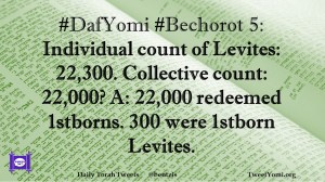 Bechorot, DafYomi #DafYomi #Bechorot 5 Date: April 25, 2019Author: ysspitz #DafYomi #Bechorot 5: Individual count of Levites: 22,300. Collective count: 22,000? A: 22,000 redeemed 1stborns. 300 were 1stborn Levites. Share this: Share on X (Opens in new window) X Share on Facebook (Opens in new window) Facebook Like Loading... Related