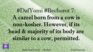 Bechorot, DafYomi #DafYomi #Bechorot 7 Date: April 25, 2019Author: ysspitz #DafYomi #Bechorot 7: A camel born from a cow is non-kosher. However, if its head & majority of its body are similar to a cow, permitted. Share this: Share on X (Opens in new window) X Share on Facebook (Opens in new window) Facebook Like Loading... Related
