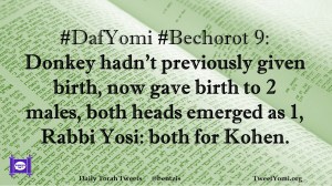 Bechorot, DafYomi #DafYomi #Bechorot 9 Date: April 25, 2019Author: ysspitz #DafYomi #Bechorot 9: Donkey hadn’t previously given birth, now gave birth to 2 males, both heads emerged as 1, Rabbi Yosi: both for Kohen. Share this: Share on X (Opens in new window) X Share on Facebook (Opens in new window) Facebook Like Loading... Related