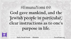EmunaYomi #EmunaYomi 69 Date: April 25, 2019Author: ysspitz #EmunaYomi 69: God gave mankind, and the Jewish people in particular, clear instructions as to one’s purpose in life. Share this: Share on X (Opens in new window) X Share on Facebook (Opens in new window) Facebook Like Loading... Related